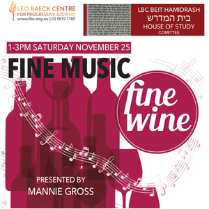 Join us for our Fine Music Fine Wine November gathering, as Mannie Gross presents musical treats and wines for us to sample. Join us for a chavurah lunch before the presentation. Please bring a non-meat food to share.