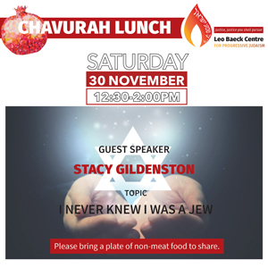 This Shabbat after the kiddush blessings please join us for the Chavurah Lunch. Enjoy the good food and fellowship and get to know some of our members in a social setting. Please bring a non-meat dish to share for lunch.